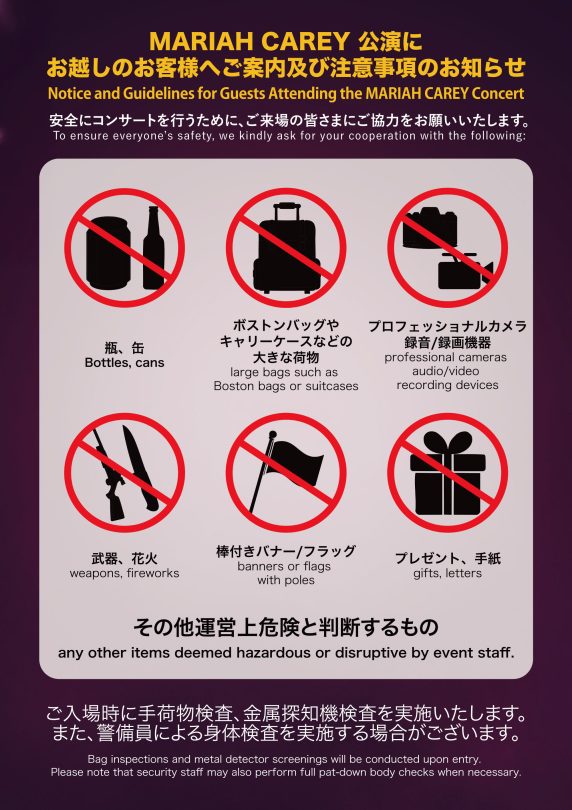 - 安全にコンサートを行うために、ご来場の皆さまにご協力をお願いいたします。 ・ご入場時に手荷物検査、金属探知機検査を実施いたします。また、警備員による身体検査を実施する場合がございます。 ・持ち込み禁止物については以下をご確認ください。 瓶、缶、ボストンバッグやキャリーケースなどの大きな荷物、プロフェッショナルカメラ、録音/録画機器、武器、花火、棒付きバナー/フラッグ、その他運営上危険と判断するもの ・出演者へのプレゼント、手紙などはお受け取りできません。また、会場スタッフが代わってお預かりもできません。ご理解とご協力のほどお願いいたします。 Notice and Guidelines for Guests Attending the MARIAH CAREY Concert To ensure everyone’s safety, we kindly ask for your cooperation with the following: Bag inspections and metal detector screenings will be conducted upon entry. Please note that security staff may also perform full pat-down body checks when necessary. The following items are not permitted inside the venue: Bottles, cans, large bags such as Boston bags or suitcases, professional cameras, audio/video recording devices, weapons, fireworks, banners or flags with poles, and any other items deemed hazardous or disruptive by event staff. We are unable to accept any gifts, letters, or other items for the performers. Venue staff are also not able to accept them on your behalf. We appreciate your understanding and cooperation.