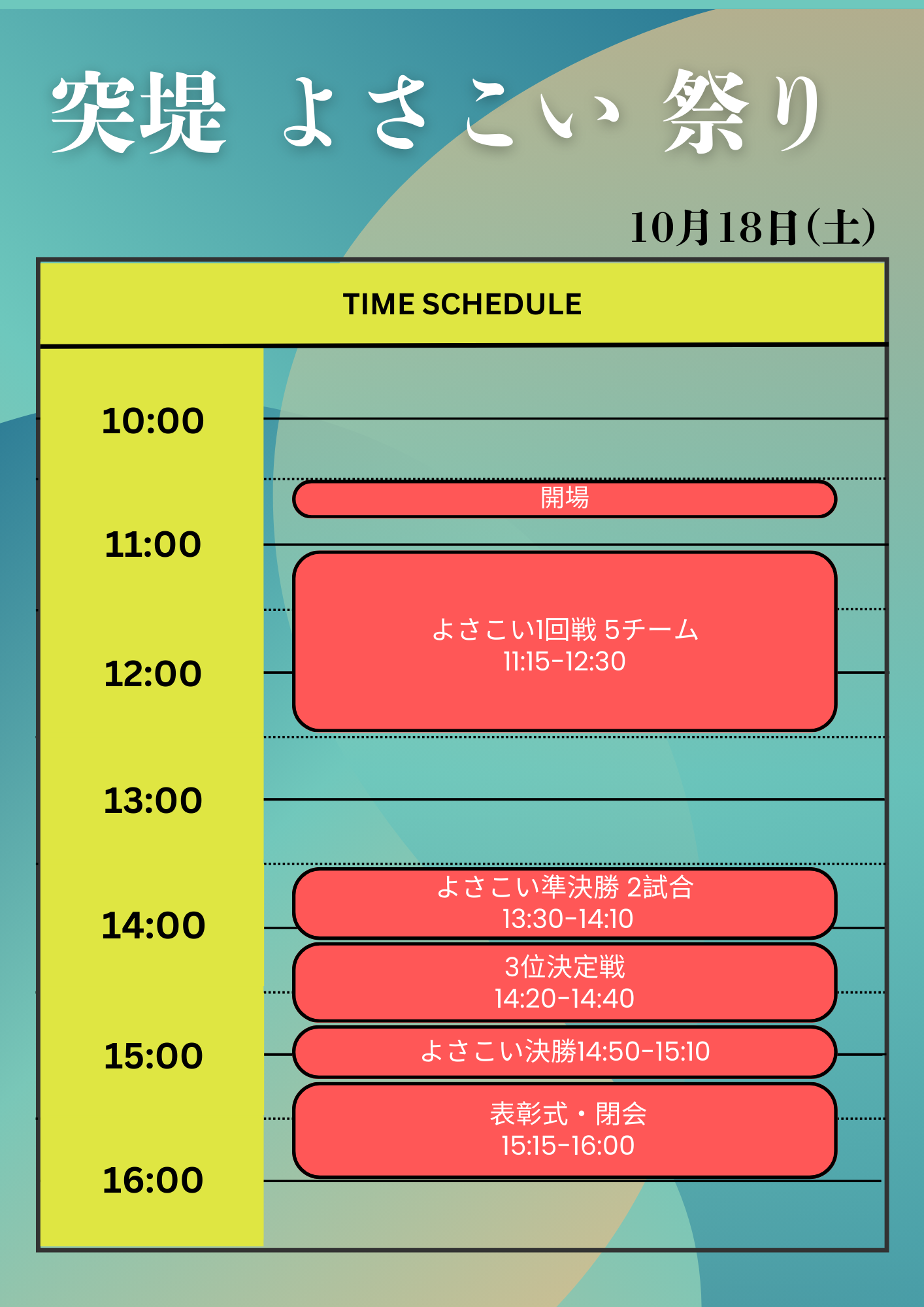 お気に入りに追加共有Item 1 of 1 イベント名 突堤 よさこい 祭り 開催日 2025.10.18 会場 TOTTEI PARK 時間 イベント開催時間:10:00~18:00 キッチンカー出店時間:10:00~18:00 神戸港を臨む開放感抜群のパークで学生よさこいチームが集結し、圧巻のステージパフォーマンスを披露! 関西の強豪チームが一同に集結!!270度海に囲まれたTOTTEIPARKで熱いYOSAKOIを披露する。ダイナミックかつ一糸乱れぬ圧巻の動きで観客を圧倒!! 出演者&タイムスケジュール ※変更する可能性がございますので、予めご了承ください。 湊 朱蘭 京炎そでふれ!咲産華 京炎そでふれ!おどりっつ 京炎そでふれ!彩京前線 お気に入りに追加共有