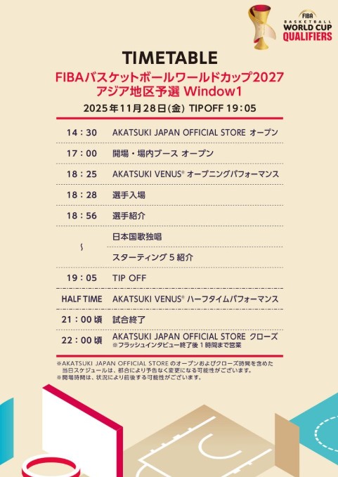 お気に入りに追加共有Item 1 of 1 イベント名 FIBAバスケットボールワールドカップ2027アジア地区予選 Window1 出演者 男子日本代表チーム(22位) vs 男子チャイニーズ・タイペイ代表チーム(67位) 開催日 2025.11.28 時間 2025年11月28日(金) TIPOFF 19:05 URL https://fibaworldcup2027-asianqualifiers.japanbasketball.jp/ お気に入りに追加共有