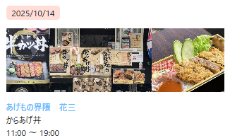 お気に入りに追加共有Item 1 of 2 開催日 2025.10.14 会場 TOTTEI PARK 時間 11:00-19:00 ※なくなり次第終了。 URL あげもの界隈 花三:詳しくはこちら ※メニュー内容は売り切れ等、都合により変更となる可能性がございます。 TOTTEI飲食店 テイクアウトメニュー情報 イベント概要 TOTTEI PARKにキッチンカーが登場します。 TOTTEIでピクニック気分でお楽しみください。お気に入りに追加共有