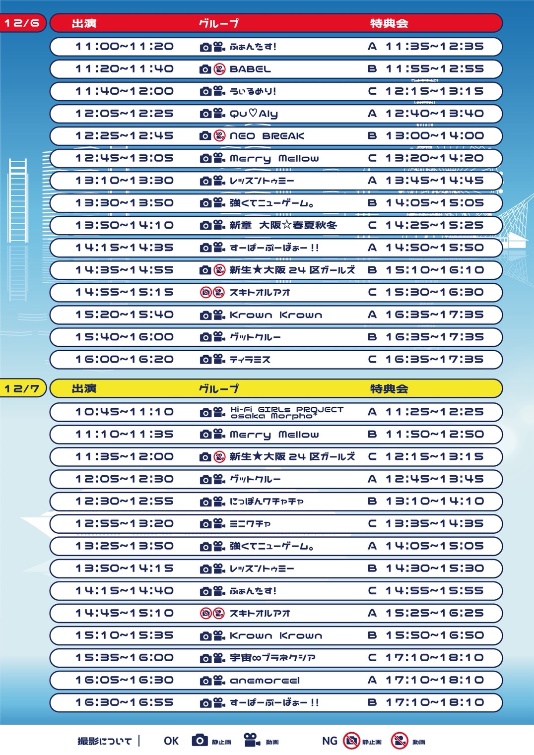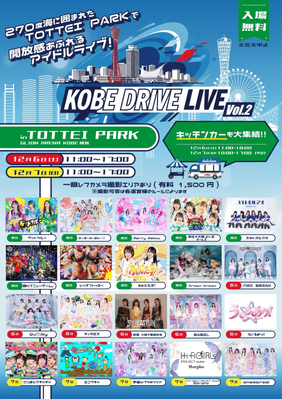 お気に入りに追加共有Item 1 of 3 イベント名 KOBE DRIVE LIVE Vol.2 開催日 2025.12.6-12.7 会場 TOTTEI PARK 時間 12/6(土)11:00~18:00 12/7(日)10:45~18:30 主催者・ お問い合わせ 株式会社One Bright KOBE イベントに関するお問い合わせはこちら ※タイムスケジュール公開!! 9月に開催したアイドルライブ×キッチンカーイベント第2弾の開催が決定! 前回よりも多い19組のアイドルグループが、2日間にわたりパフォーマンスを披露!神戸の新たな”夢のステージ”をぜひお楽しみください。 12/6(土) DAY1 グットクルー すーぱーぷーばぁー!! Merry Mellow 新生★大阪24区ガールズ スキトオルアオ 強くてニューゲーム。 レッスントゥミー Krown Krown NEO BREAK Qu♡Aly ティラミス 新章 大阪★春夏秋冬 BABEL うぃるめり! ふぁんたす! 12/7(日) DAY2 にっぽんワチャチャ ミニワチャ 宇宙∞プラネクシア Hi-Fi GIRLs PROJECT osaka Morpho anemoreel ふぁんたす! グットクルー すーぱーぷーばぁー!! Merry Mellow 新生★大阪24区ガールズ スキトオルアオ 強くてニューゲーム。 レッスントゥミー Krown Krown タイムスケジュール 会場 観覧料金 一般席:無料 一眼レフ撮影エリア:1,500円(税込) 特典会/物販情報 各グループからの発表をご確認ください。 TOTTEI 周辺グルメ紹介 お気に入りに追加共有