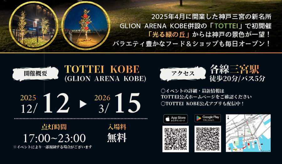 - 夕陽がきれいなサンセットタイムの後、日没17:00~よりTOTTEI PARK緑の丘や周辺エリアではイルミネーションが点灯します。 なかでも丘状の建築物「緑の丘」は、クリスマスカラーにきらめく『登れる新感覚のイルミネーション』として、神戸港の夜景とともに特別なひとときをお過ごしいただけます。TOTTEI初のクリスマスイルミネーションです。 ※クリスマスマーケット終了後は、シーズン毎にテーマ色を変えてライトアップ継続予定です。 周辺の新港町エリアでも12月12日より「NEW SEAPORT ナイトライト2025-2026」としてまちなかがシャンパンゴールドのイルミネーションで輝きます。