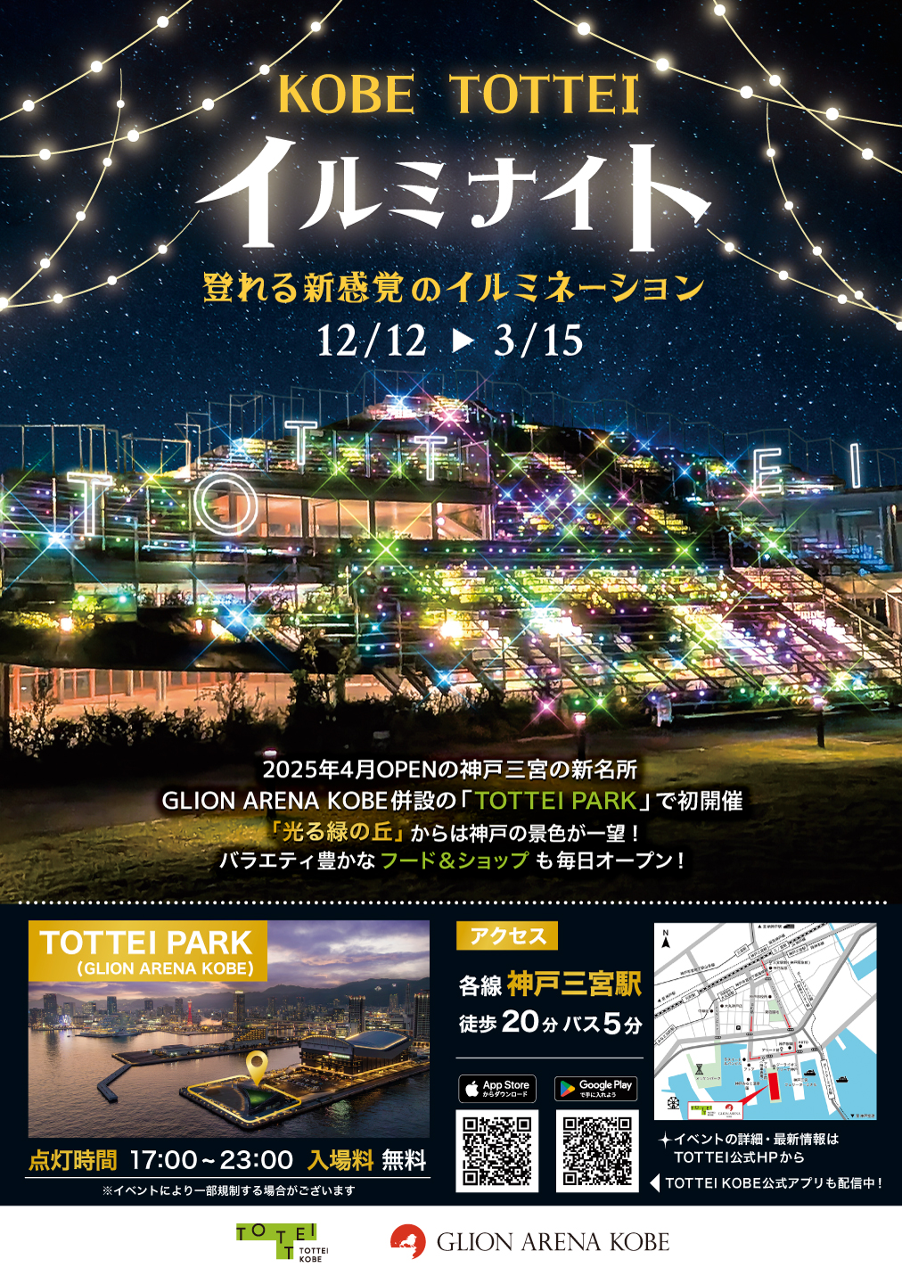 - 夕陽がきれいなサンセットタイムの後、日没17:00~よりTOTTEI PARK緑の丘や周辺エリアではイルミネーションが点灯します。 なかでも丘状の建築物「緑の丘」は、『登れる新感覚のイルミネーション』として、神戸港の夜景とともに特別なひとときをお過ごしいただけます。 新港町周辺においても「NEW SEAPORTナイトライト2025-2026」としてシャンパンゴールドで輝きます。 また、神戸ルミナリエとの特別コラボレーションとしてエリア内2カ所(波止場町緑地、神戸ポートミュージアム周辺)にルミナリエ作品を設置します。 TOTTEI開業で盛り上がる新エリアの新港町周辺(NEW SEAPORT)を、ぜひこの機会にお楽しみください。