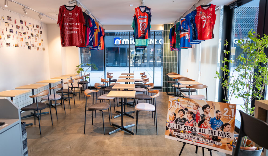 【カフェ内装】選手サイン入りユニフォームやフォトウォールの展示