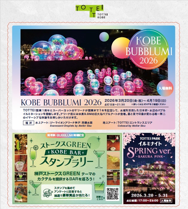 神戸ウォーターフロントアートプロジェクト実行委員会(住所:兵庫県神戸市)は、2026年3月20日(金)~4月19日(日)の間、日本初・270度海に囲まれたGLION ARENA KOBE(ジーライオンアリーナ神戸。以下、アリーナ)と周辺エリア:TOTTEI(トッテイ)の開港1周年を記念し、「KOBE BUBBLUMI(神戸バブルミ)2026」を開催します。
