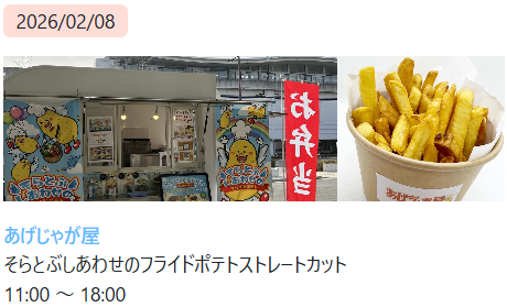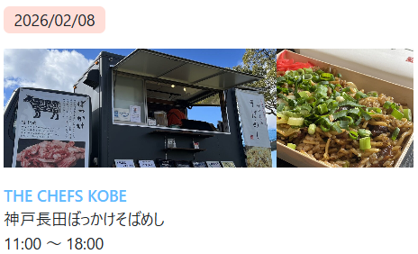 お気に入りに追加共有Item 1 of 3 開催日 2026.2.8 会場 TOTTEI PARK 時間 11:00-18:00 ※なくなり次第終了 URL THE CHEFS KOBE:詳しくはこちら あげじゃが屋:詳しくはこちら ※メニュー内容は売り切れ等、都合により変更となる可能性がございます。 TOTTEI飲食店 テイクアウトメニュー情報 イベント概要 TOTTEI PARKにキッチンカーが登場します。 TOTTEIでピクニック気分でお楽しみください。お気に入りに追加共有