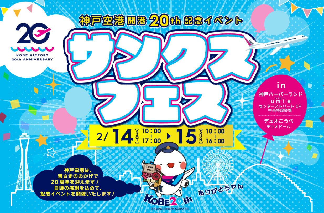- 2026年2月16日(月)に神戸空港が開港20周年を迎えることを記念し、「神戸空港開港20周年 サンクスフェス」が開催されます。 神戸ハーバーランドumie会場およびデュオこうべにおいて、就航地物産・観光PRブースや就航エアラインによるPRブース、スタンプラリー、20年のあゆみ展などを開催し、お子さまから大人の方まで楽しめる内容を予定しています。 また、神戸空港では、普段は立ち入れない飛行場周りの道路をバスで巡り、滑走路などを見学いただける「空港場内バスツアー」も開催します TOTTEI/GLION ARENA KOBEからもアクセスがよい神戸空港は、以前神戸ストークスのストーキーとのコラボで「GLION ARENA KOBE」と神戸ストークスのコラボ企画のYouTube ~神戸空港ルート編~ でもご紹介しています。ぜひあわせてご覧ください。 開催場所: 神戸ハーバーランドumie センターストリート1F中央特設会場 デュオこうべ デュオドーム 神戸空港(空港場内バスツアー/2月14日(土)のみ実施。事前応募制。) 中突堤中央ターミナル(かもめりあ)(高速船「神戸—関空ベイ・シャトル」体験乗船会/事前応募制) 入場料:無料