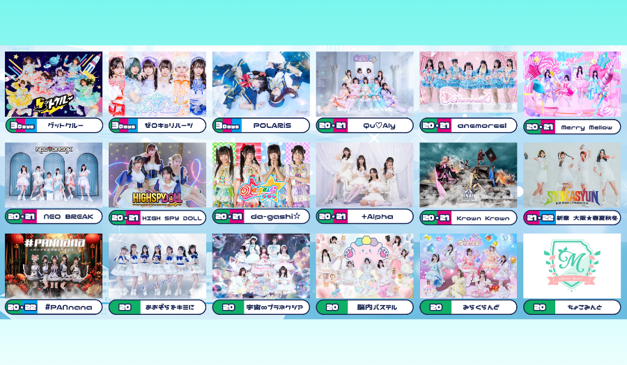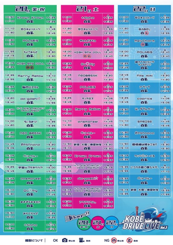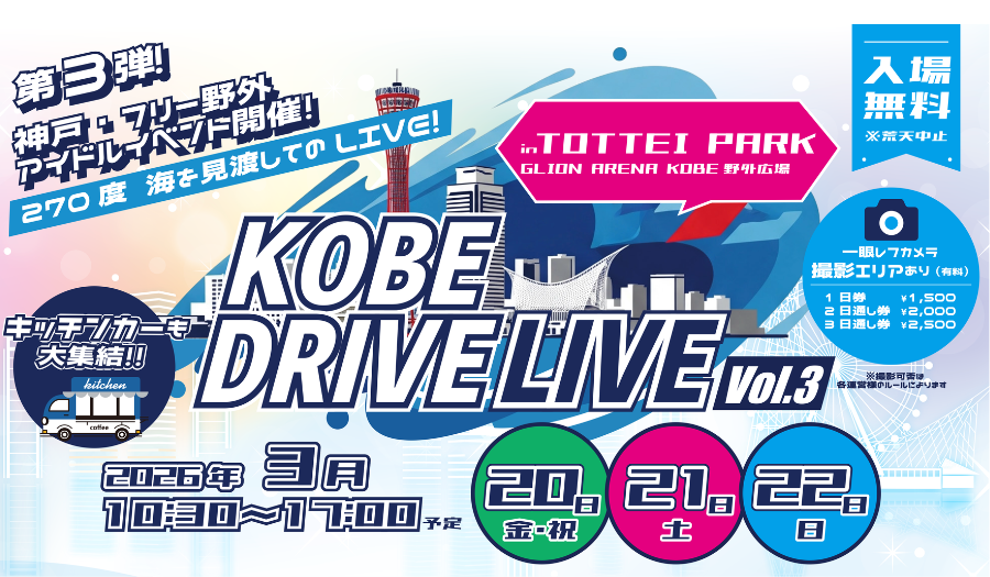 - 過去最多!総勢36組のアイドルグループが、3日間にわたりステージトラックでパフォーマンスを披露!270度海に囲まれた神戸の港・TOTTEI PARKで、新たな”夢のステージ”をぜひお楽しみください!キッチンカーも大集結予定です! 入場:無料 ◆一眼レフ撮影エリアあり 1日券:¥1,500(税込) 2日通し券:¥2,000(税込) 3日通し券:¥2,500(税込)