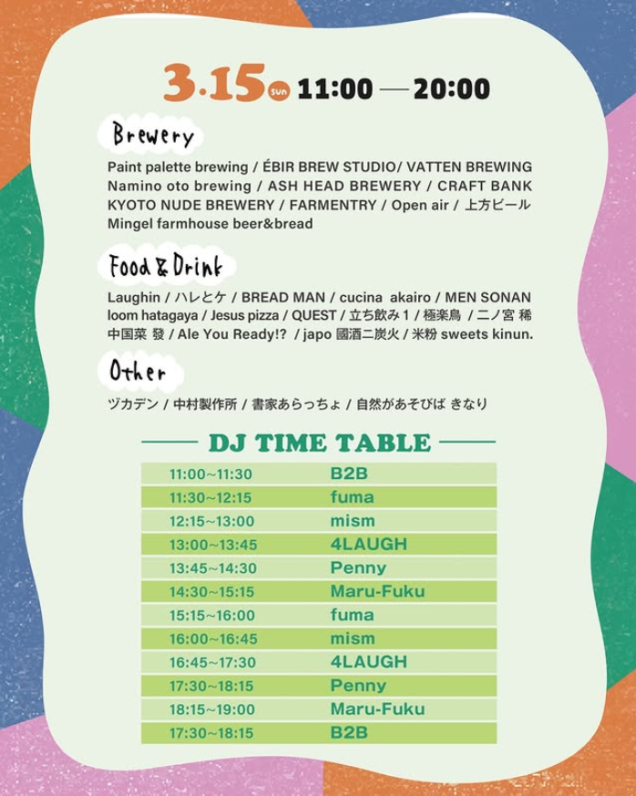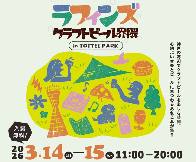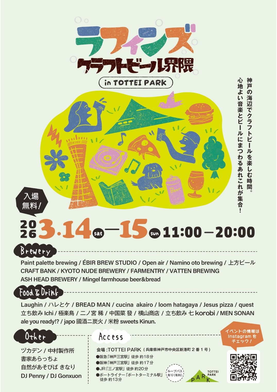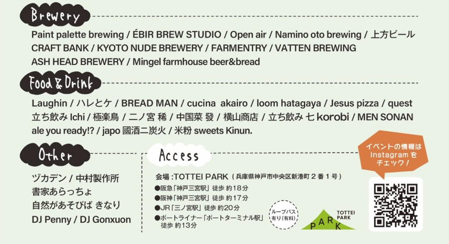 - 三宮中心の飲食店がTOTTEI PARKに集結! ビール×フード×音楽をテーマにイベントを開催 神戸の海辺でクラフトビール、フード、音楽を楽しむ時間 いつもとは違う時間をお届けします 【出店店舗】 ●Brewery Paint palette brewing / ÉBIR BREW STUDIO / Open air / Namino oto brewing/上方ビール / CRAFT BANK / KYOTO NUDE BREWERY / FARMENTRY/VATTEN BREWING / ASH HEAD BREWERY / Mingel farmhouse beer&bread ●Food&Drink Laughin / ハレとケ / BREAD MAN / cucina akairo / loom hatagaya/Jesus pizza / quest / 立ち飲み Ichi / 極楽鳥 / 二ノ宮 稀 / 中国菜 發 横山商店 / 立ち飲み 七 korobi / MEN SONAN / ale you ready?/ japo 國酒二炭火 / 米粉 sweets Kinun. ●Other ヅカデン / 中村製作所 / 書家あらっちょ / 自然あそびば きなり/DJ Penny / DJ Gonxuon