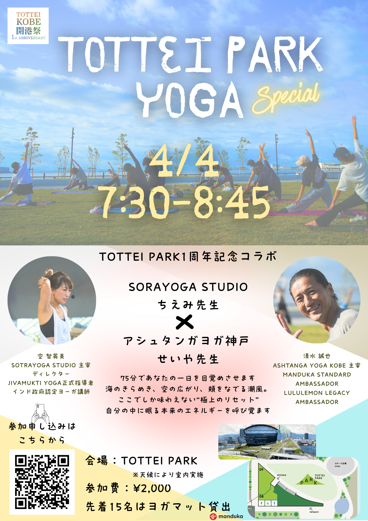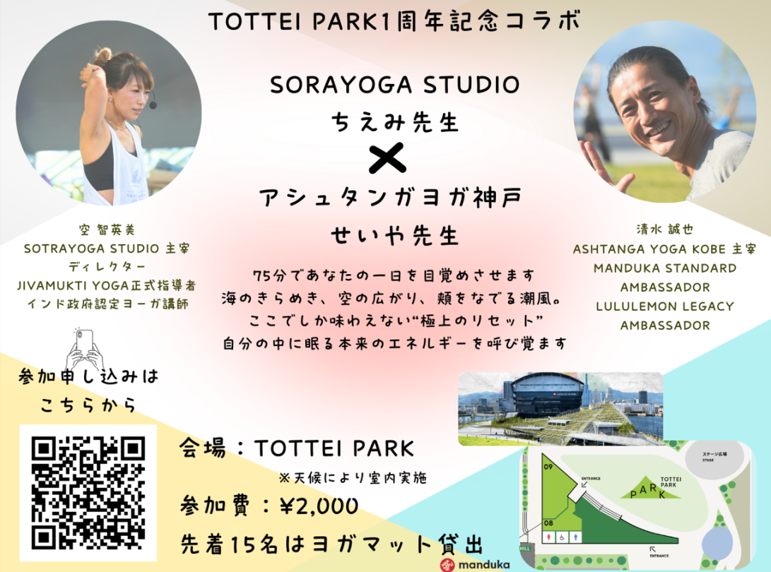 - 「75分であなたの一日を目覚めさせます。海のきらめき、空の広がり、頬をなでる潮風。ここでしか味わえない“極上のリセット”。自分の中に眠る本来のエネルギーを呼び覚ます。」 第一回の開催から講師として関わる「SORAYOGA studio」の空智英美先生と、「アシュタンガヨガ神戸」の清水誠也先生による、TOTTEI PARK 1周年記念の拡大75分スペシャルコラボレッスン。 初心者の方も大歓迎!自分の中に眠る本来のエネルギーを呼び覚まし、あなたらしさを大切にする時間を過ごしませんか? ご希望の方で先着15名様には、ヨガマットをお貸出しします。 <インストラクター紹介> 空 智英美先生: SORAYOGA STUDIO主宰。 JIVAMUKTI YOGA正式指導者、インド政府認定ヨガ講師。 清水 誠也先生 ASHTANGA YOGA KOBE主宰。 MANDUKA STANDARD AMBASSADOR、LULULEMON LEGACY AMBASSADOR。