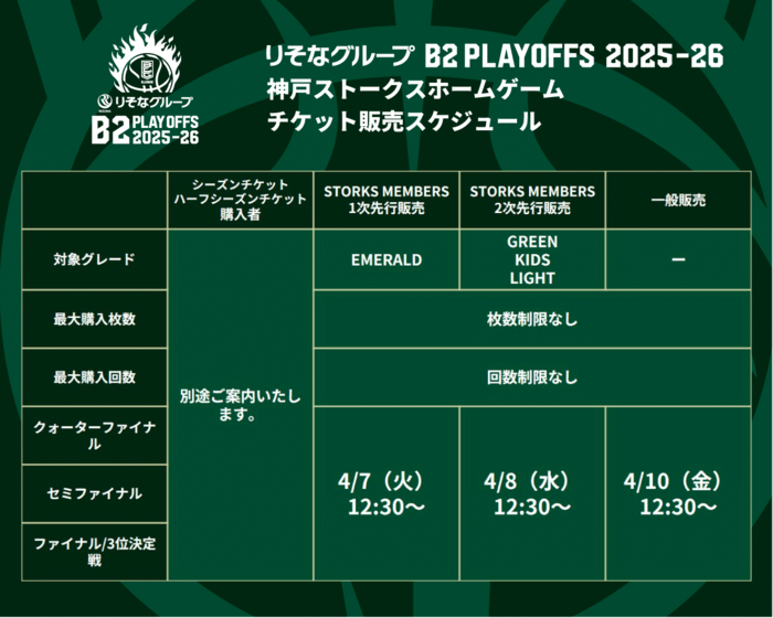 りそなグループ B2 PLAYOFFS 2025-26 ホーム開催時チケット概要(神戸ストークス公式サイト)