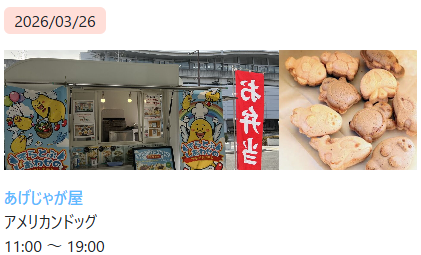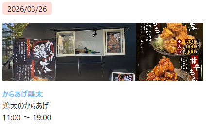 お気に入りに追加共有Item 1 of 3 開催日 Invalid Date 会場 TOTTEI PARK 時間 11:00~19:00 ※なくなり次第終了 URL からあげ鶏太:詳しくはこちら あげじゃが屋:詳しくはこちら ※メニュー内容は売り切れ等、都合により変更となる可能性がございます。 TOTTEI飲食店 テイクアウトメニュー情報 お気に入りに追加共有