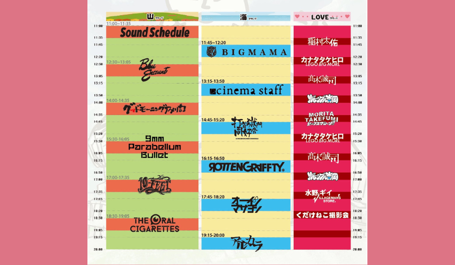 - アルカラ / オーイシマサヨシ / THE ORAL CIGARETTES / cinema staff / 9mm Parabellum Bullet / Sound Schedule / BIGMAMA / BLUE ENCOUNT / 10-FEET / ROTTENGRAFFTY / 打首獄門同好会 / グッドモーニングアメリカ