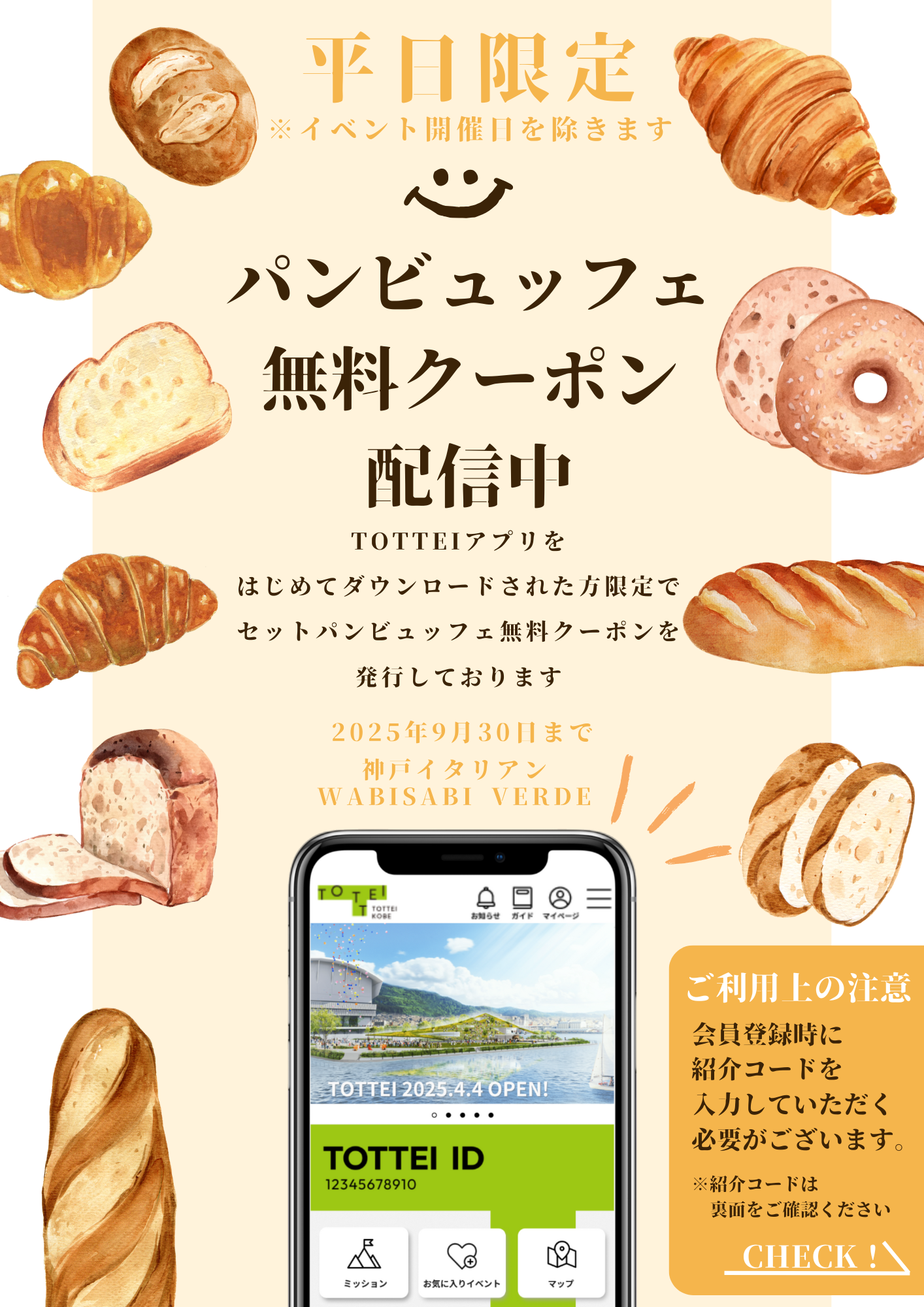 TOTTEI KOBE 公式アプリをはじめてダウンロードし、会員登録時に下記紹介コードを入力された方限定で、神戸イタリアン WABISABI VERDEの「セットパンビュッフェ無料クーポン」を配信中です。