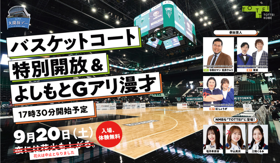 GLION ARENA KOBE運営会社の株式会社One Bright KOBE(住所:神戸市中央区、代表取締役社長 渋谷 順)は、アリーナ無料開放イベント「Gアリ大開放デー」を9月20日(土)に開催します。第4弾となる今回は、バスケットボールコートの特別開放&アリーナ初のよしもと芸人による漫才ライブを開催いたします。NMB48からもメンバー3名(塩月希依音、平山真衣、三鴨くるみ)が来場決定!漫才ライブの芸人など詳細は随時公式HP、SNSでお知らせいたします。