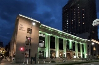 アリーナから三宮駅への帰路おすすめルートの京町筋:旧居留地の神戸市立博物館でも試合毎にGREENにライトアップし、神戸ストークスの試合開催日を盛り上げます。