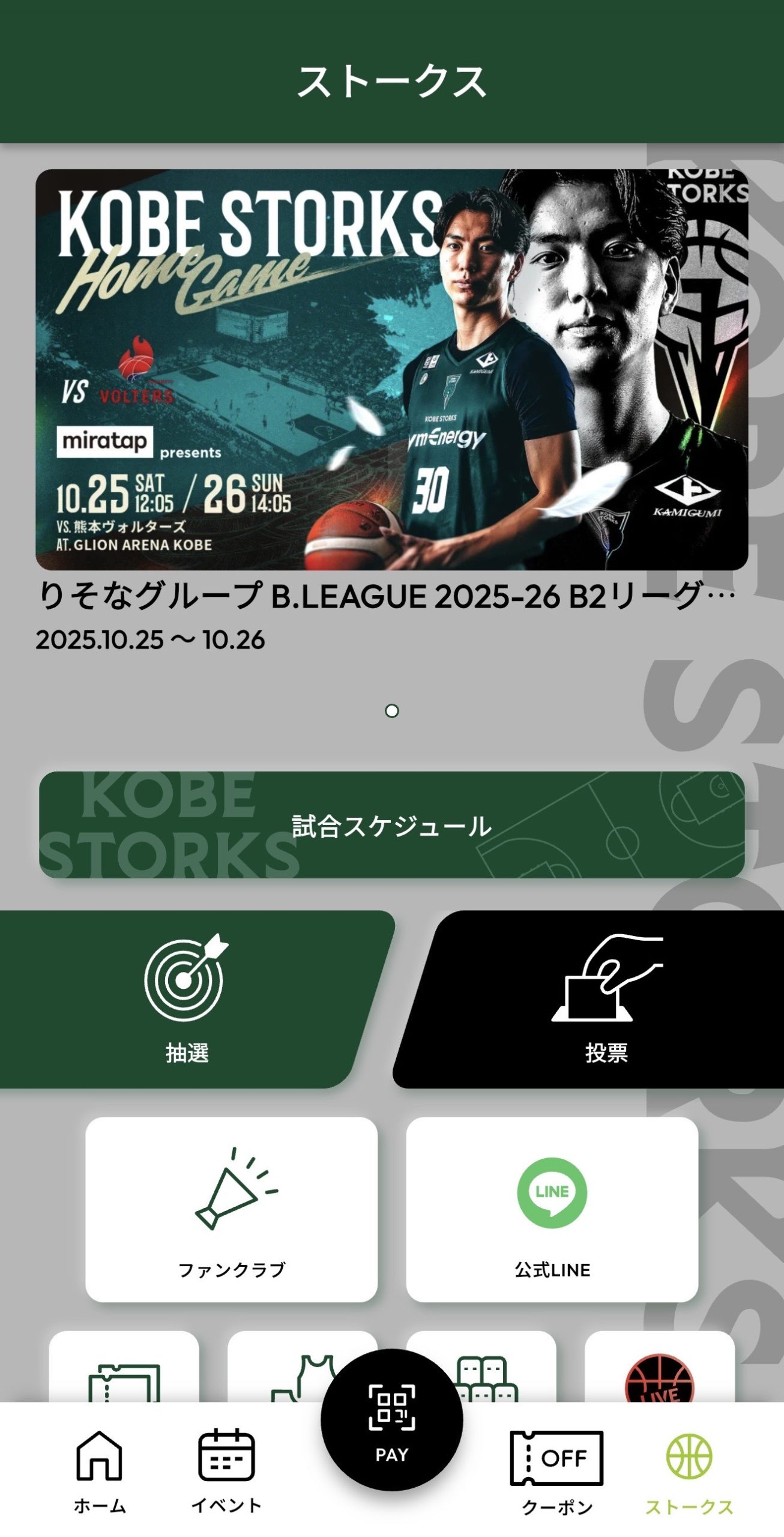 神戸ストークスのページではホームゲームに連動する「抽選」「投票」機能が追加され、より一層試合観戦を楽しめるようになりました。
