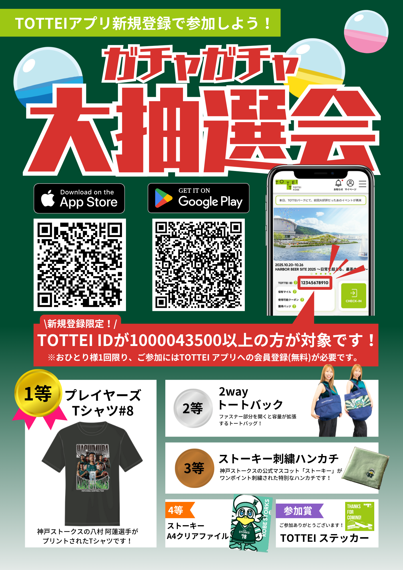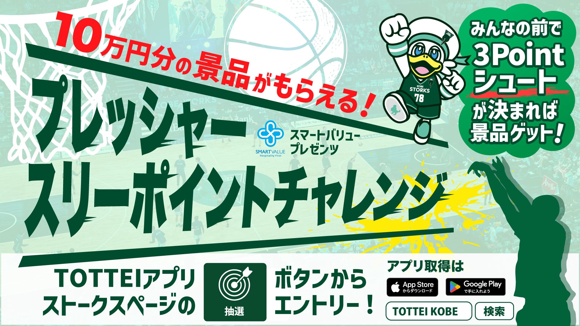 このたび10月25日(土)・26日(日)にGLION ARENA KOBEにて開催されます「りそなグループ B.LEAGUE 2025-26 B2リーグ戦 第5節 神戸ストークス vs 熊本ヴォルターズ」において、TOTTEI KOBE公式アプリの会員様を対象としたキャンペーンを開催いたします。