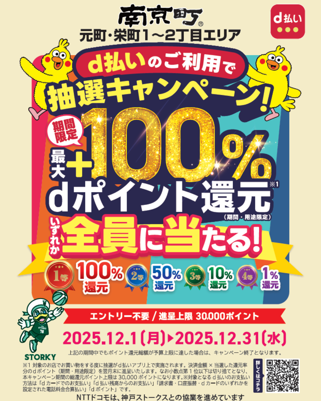 12月の期間中、TOTTEI / GLION ARENA KOBE内のグルメ店舗をでd払いをご利用いただくと、抽選でdポイント(期間・用途限定)が最大100%還元されます。(ハズレ無し)