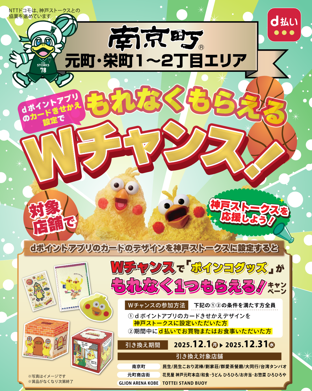 神戸 元町・栄町1~2丁目エリアの対象店舗で実施するNTTドコモ「d払い抽選キャンペーン」にTOTTEI / GLION ARENA KOBE内のグルメ店舗全店が参画します。