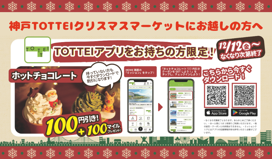 ・特典ご利用の際は、TOTTEI KOBE公式アプリからクーポンを取得いただく必要がございます。