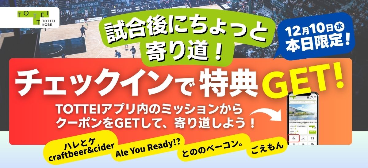 このたび12月10日(水)にGLION ARENA KOBEにて開催されます「りそなグループ B.LEAGUE B2リーグ戦 第12節 神戸ストークス vs 鹿児島レブナイズ」において、TOTTEI KOBE公式アプリの会員様を対象としたキャンペーンを開催いたします。