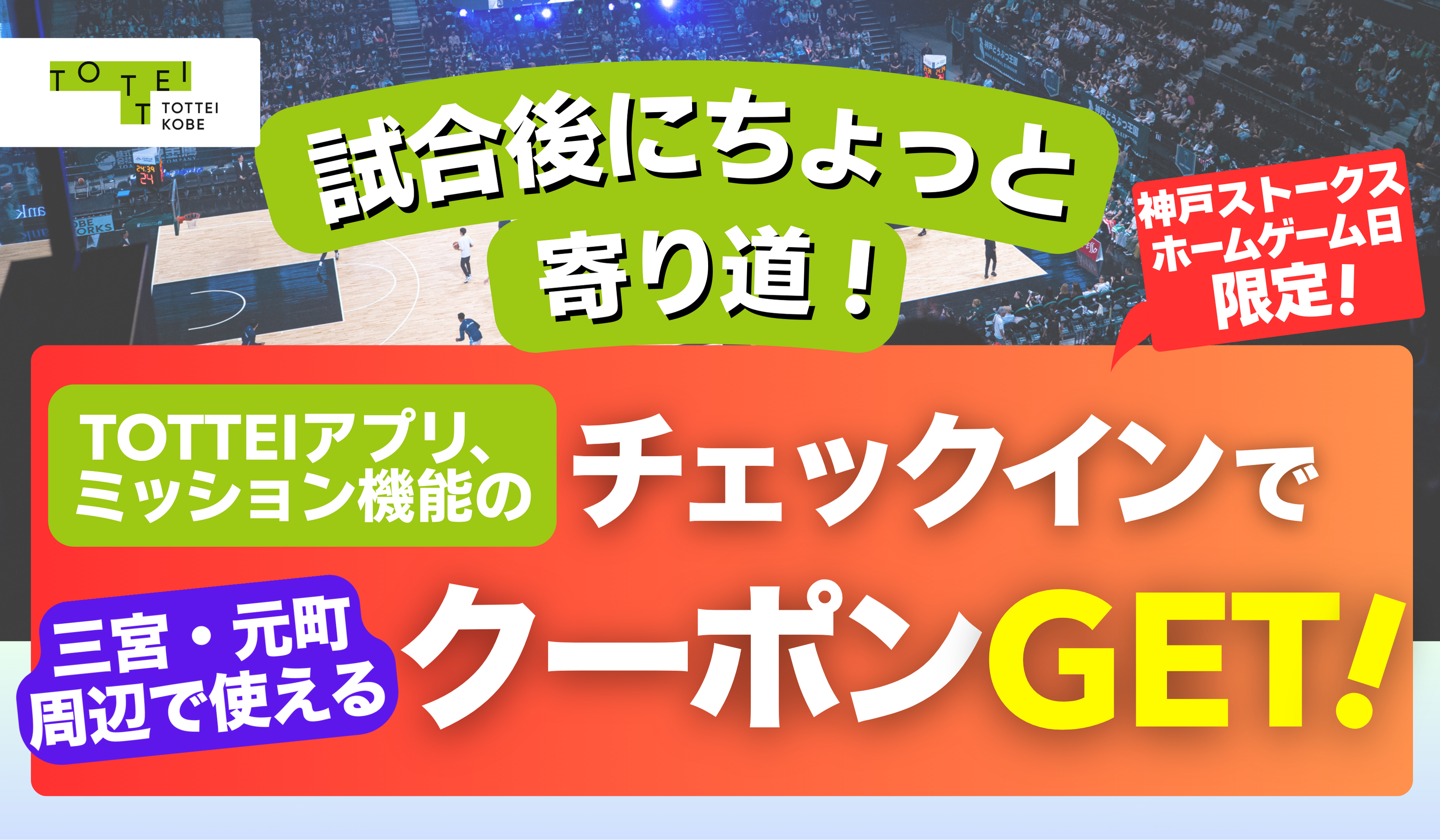 神戸ストークスのホームゲームに来場し、GLION ARENA KOBE会場内の指定場所でチェックインをすると、三宮・元町駅周辺の対象店舗で当日限定で使えるTOTTEIアプリ限定クーポンをプレゼント!試合後は余韻に浸りながら神戸の名店でグルメを楽しもう!おひとり様、ご家族連れ、福島ブースターの皆様も大歓迎!