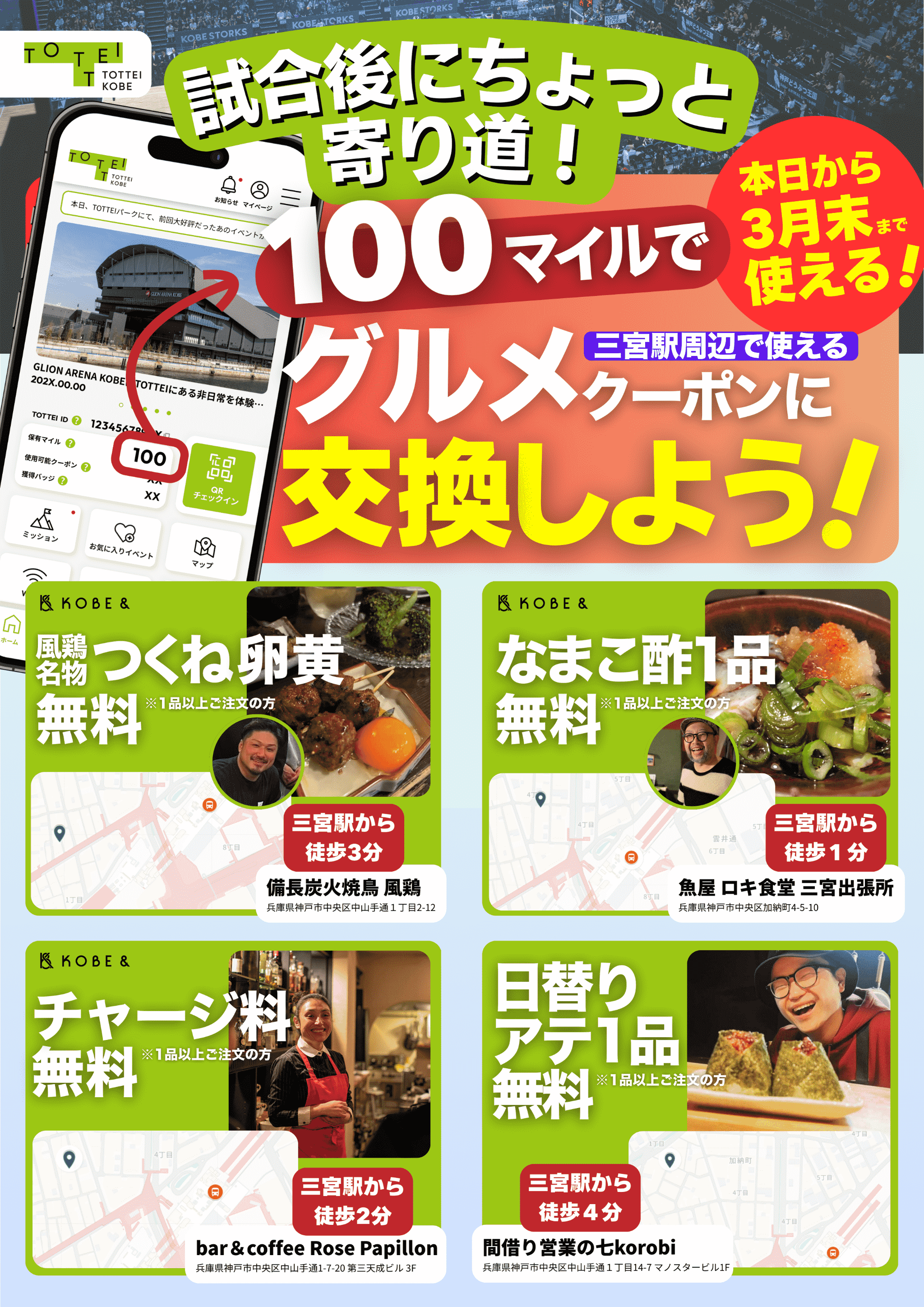 100マイルで三ノ宮駅周辺で使えるおトクなクーポンと交換可能!