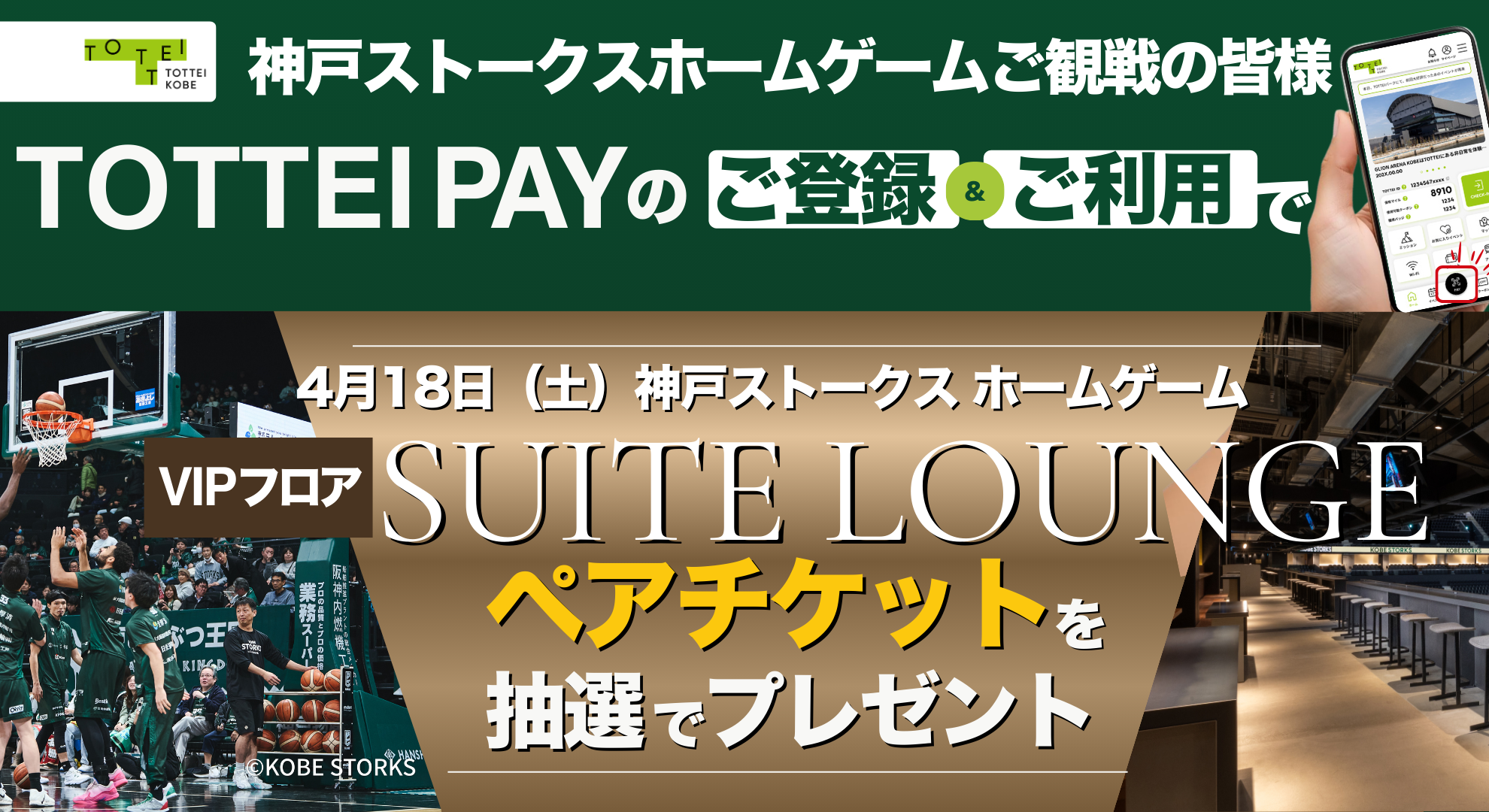 好評につき今節も開催! TOTTEI PAYのご登録&ご利用で、【2026年4月18日(土)】神戸ストークスホームゲームを契約者限定のVIPフロア「KOBE 270° Club sponsored by ANAのSUITE LOUNGE」で観戦できるペアチケットが当たるキャンペーンを開催します。初めてTOTTEI PAYを使う方も、すでにご利用いただいている方も大歓迎!この機会にぜひTOTTEI PAYをご利用ください。