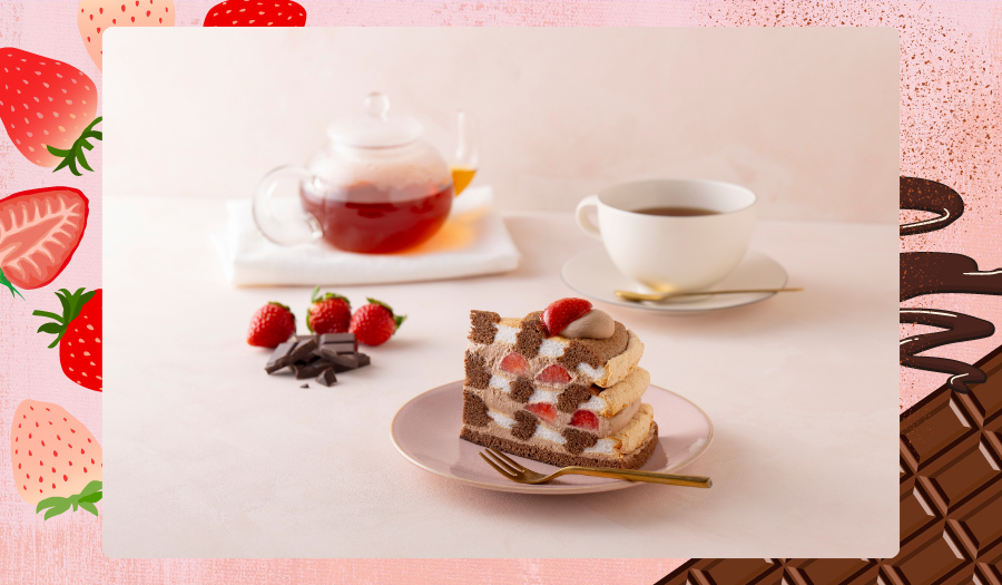 ココアの卵黄生地と卵白生地を交互に絞って焼き上げた、ふんわり軽やかなカーディナル生地に、なめらかなチョコ生クリームと甘酸っぱいいちごをサンド。食感の違いも楽しめる、冬だけのかわいらしい冬限定ケーキです。