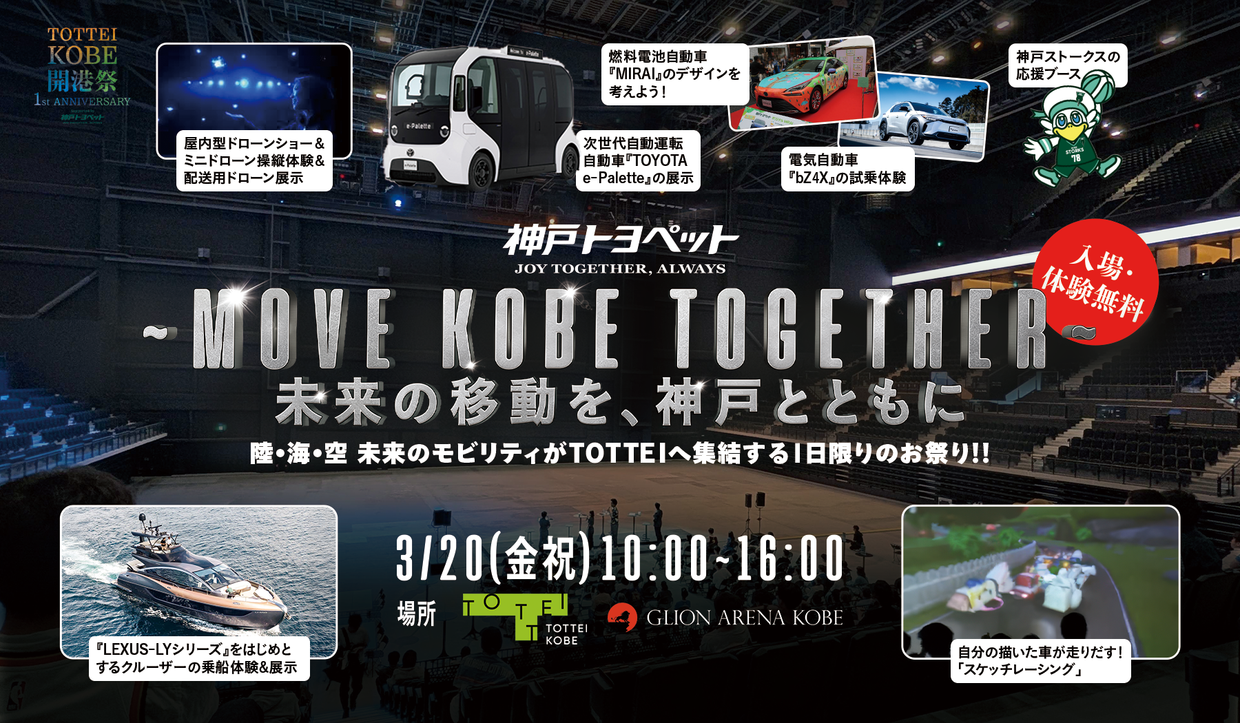 TOTTEI開業1周年をお祝いする『TOTTEI KOBE 開港祭 Supported by 神戸トヨペット』の開催初日となる3月20日(金・祝)「春分の日」に、TOTTEI及びGLION ARENA KOBEにて、『~MOVE KOBE TOGETHER~ 未来の移動を、神戸とともに』を開催します。